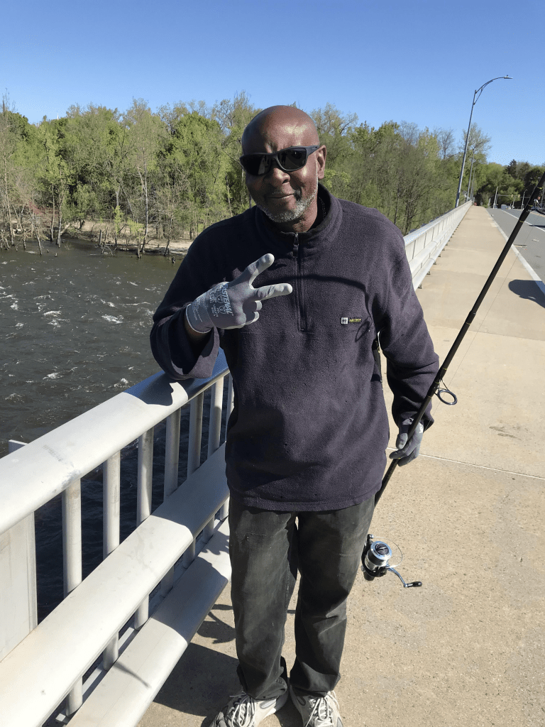 HOLYOKE/SOUTH HADLEY – Tommie Riggins conducts his fishing in a vigorous way. He prowls the Vietnam Veterans Memorial Bridge from one end to the other, reaching back with everything he has and casting powerfully into the churning white water some 35 feet below. Then he prowls some more, ever-present cigar, Black & Mild, clenched in his teeth.
